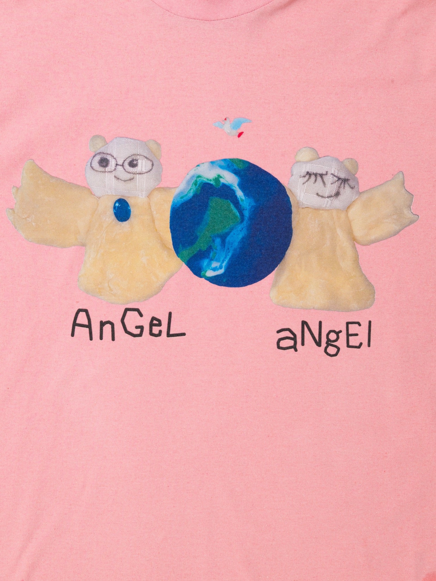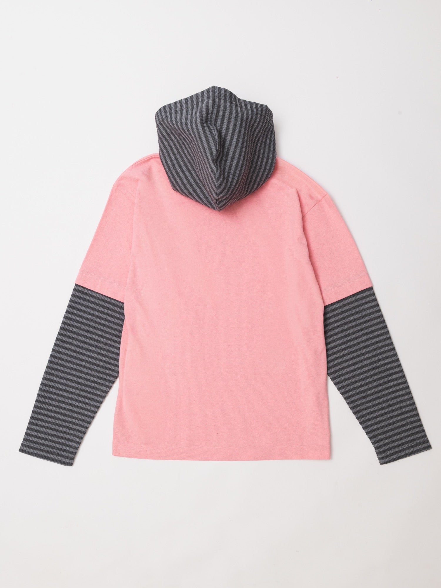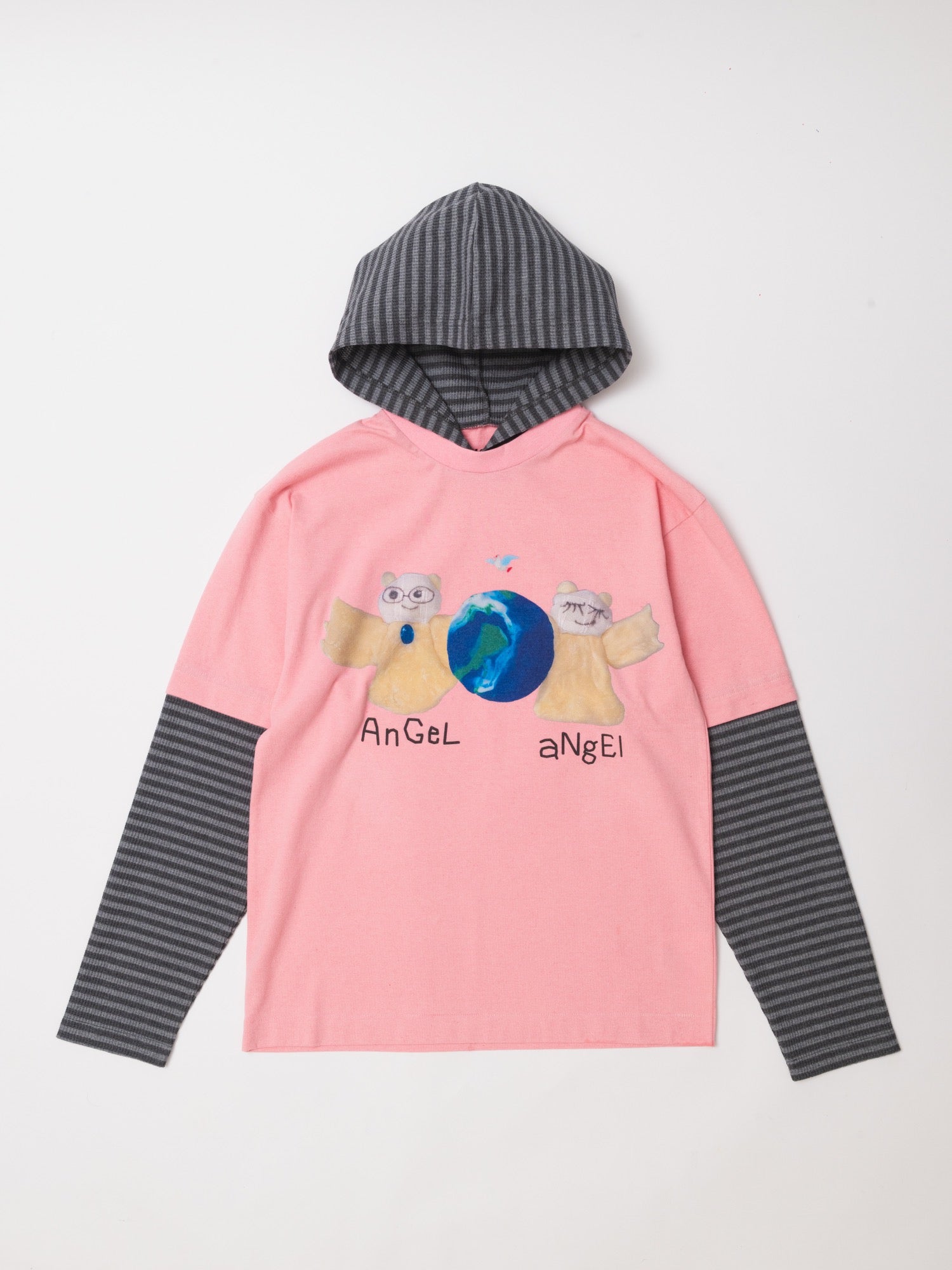アーティスト uou_cute によるグラフィックをフロントに配した一枚です。ピンクのTシャツに、フードと袖をストライプ柄で切り替え、Tシャツとフーディーを重ね着しているように見えるフェイクレイヤード仕様に仕立てています。